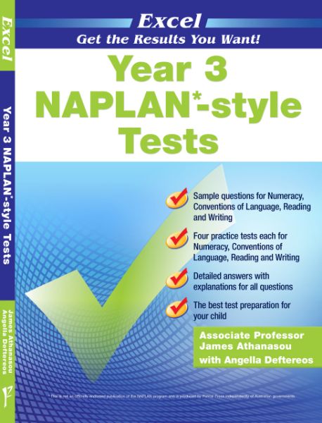 This book is designed for parents who want to help their children and for teachers who wish to prepare their class for the NAPLAN Tests. NAPLAN Tests are sat by Year 3 students Australia-wide. These tests are held in May every year. The tests are in literacy and numeracy. In literacy there are three tests: Language Conventions – ?spelling, grammar and punctuation: there are around 50 questions in this test Reading – ?comprehension: there are around 35 questions in this test Writing – ?written Expression: there is one piece of writing in this test In the numeracy test mathematics is tested. There are 35 questions in this test. Parents may also use these books separately from the tests and just as a general way of revising or when tutoring their children. This book is divided into sample questions and practice tests. It starts with samples of the literacy (Reading and Language conventions) and numeracy questions. This is then followed by four practice tests for numeracy, four practice tests for reading and four practice tests for language conventions. There is a sample writing task and four practice writing tasks. * This is not an officially endorsed publication of the NAPLAN program and is produced by Pascal Press independently of Australian governments.
